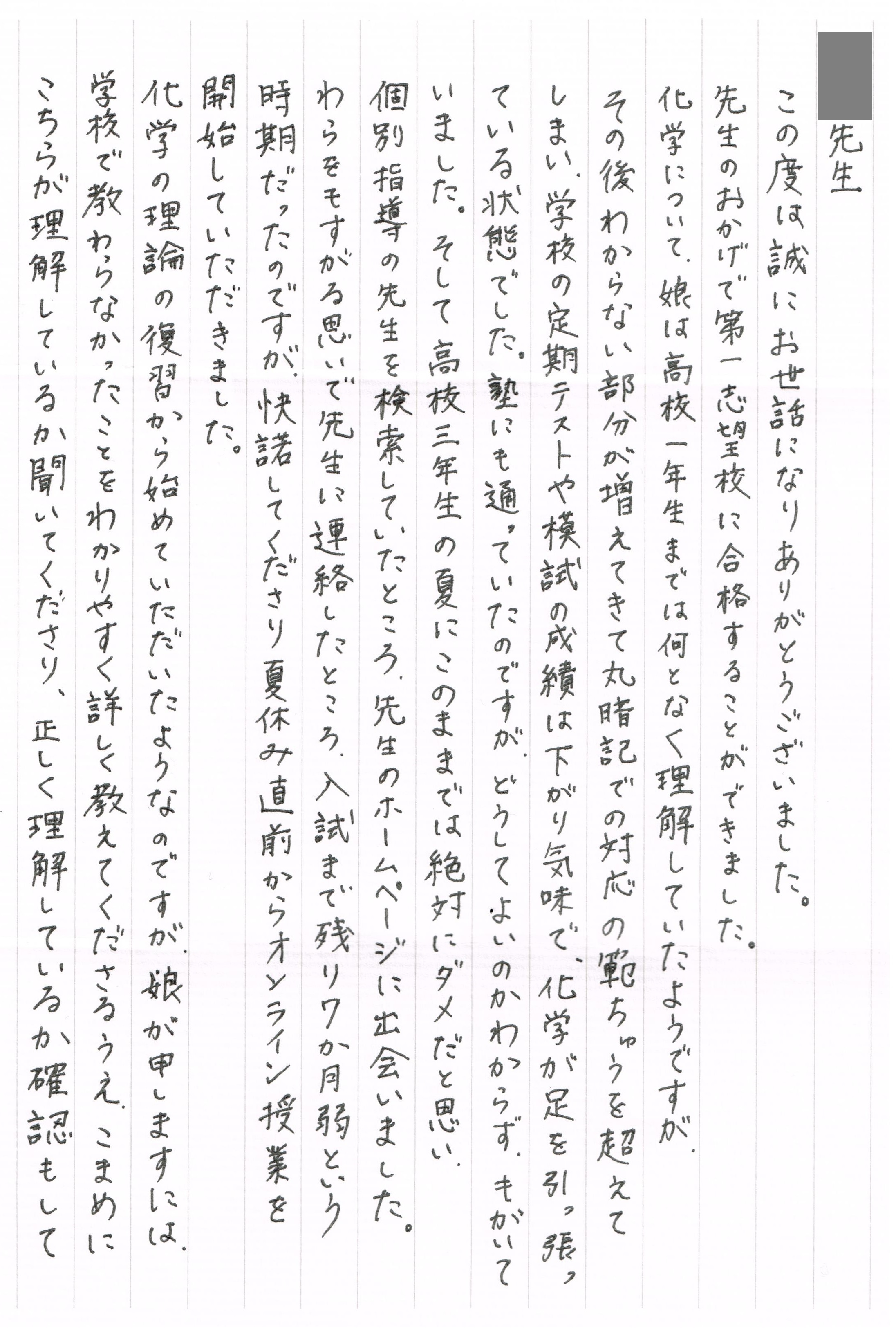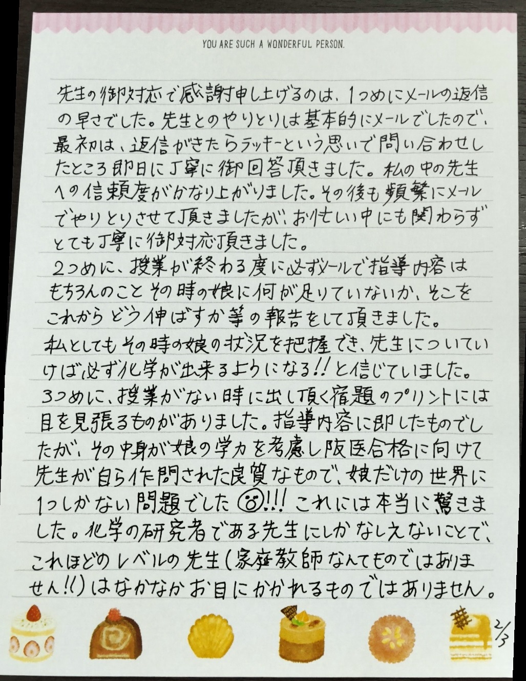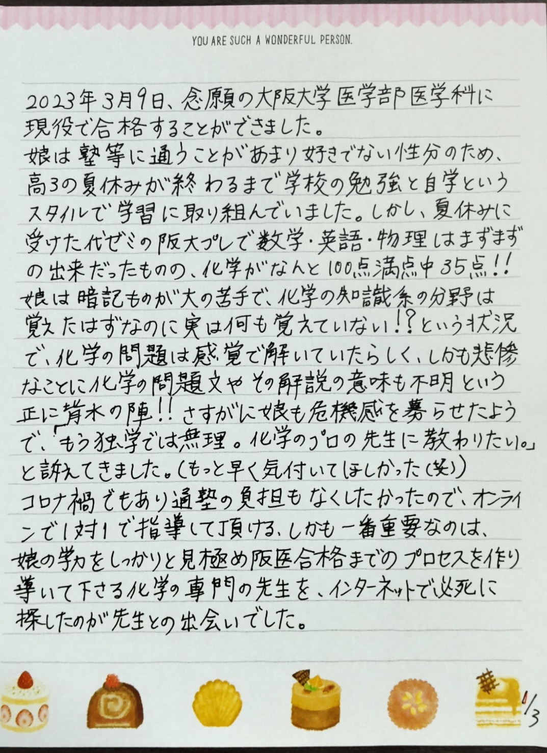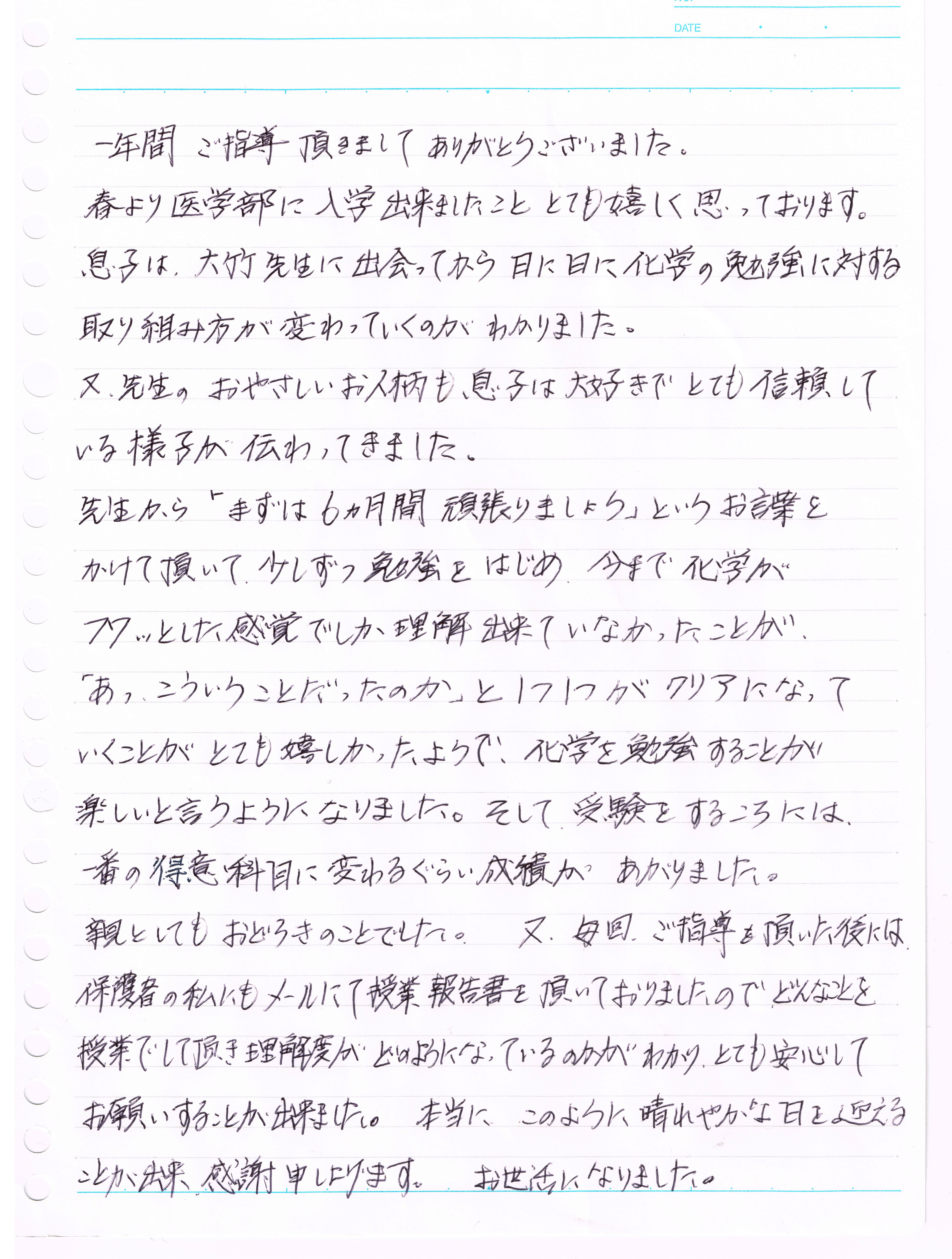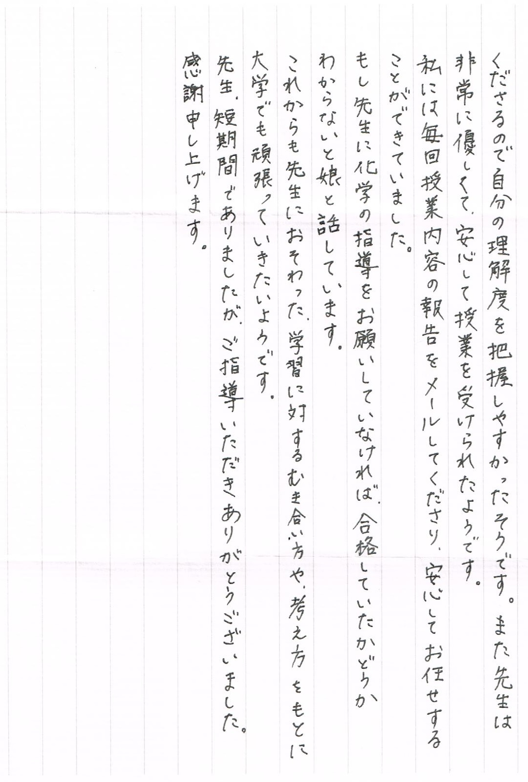 先生から教えてもらった化学は、大学の授業などでもその知識を基礎に頑張って勉強していってもらえると思いますし、その知識を娘に与えていただいた事にとてもとても本当に感謝しております。