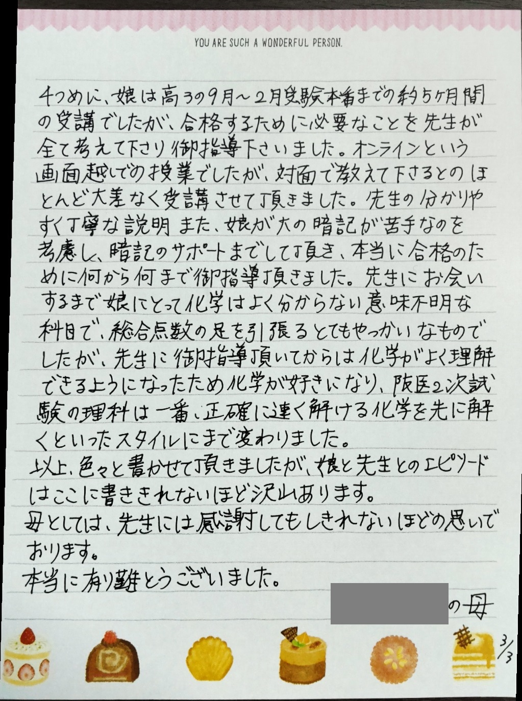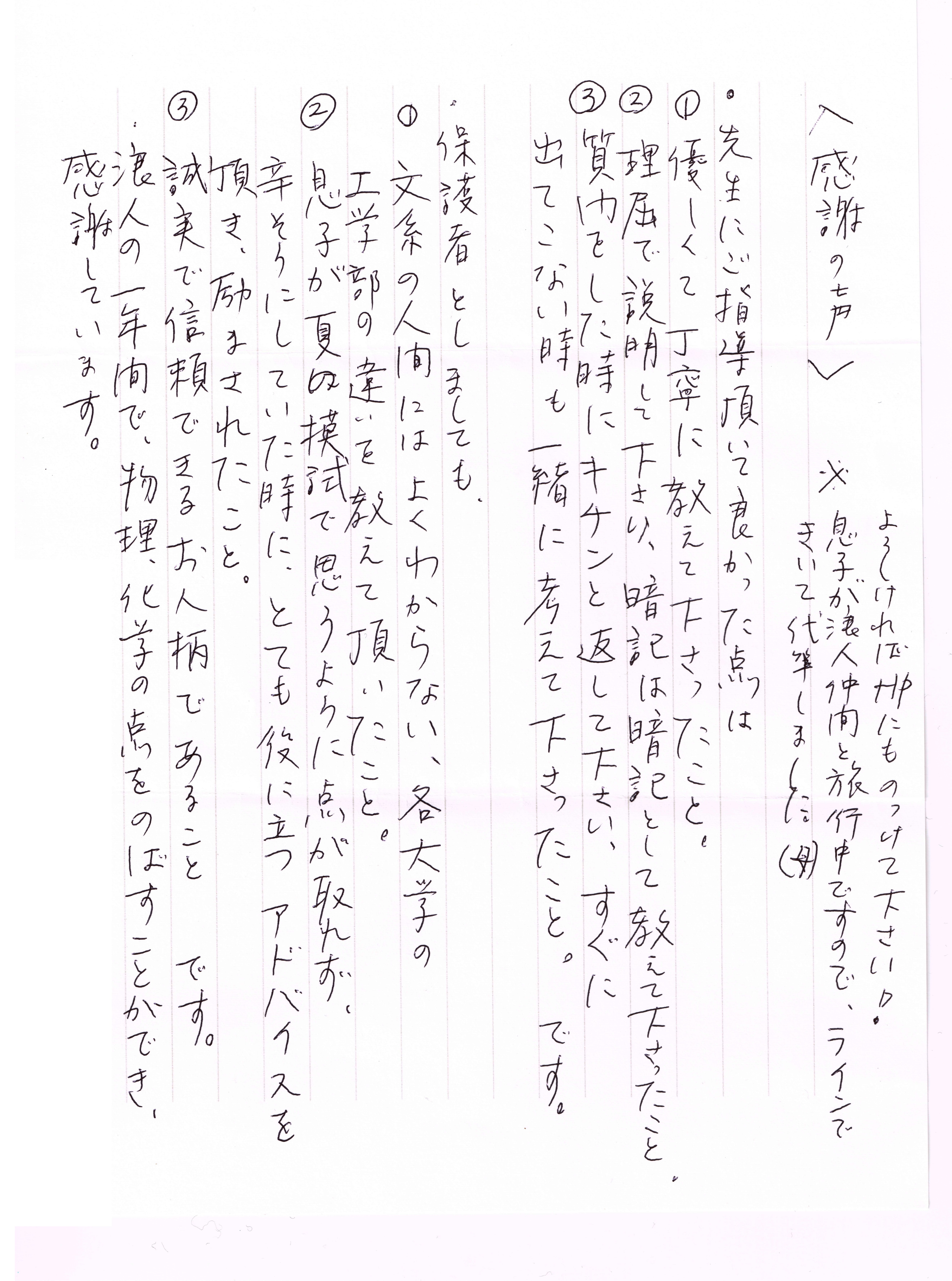3) 某工学部合格(1浪生のお母様から(一部、生徒さんのご感想の代筆も含む))